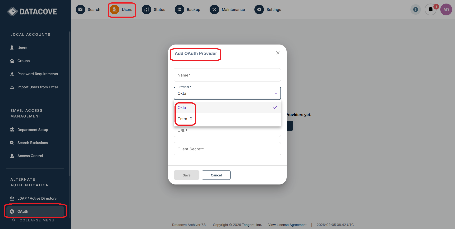 The new OAUTH User Access provisioning allows for end user access to the system when linked up to the Entra or Okta Identity Providers (IdP), eliminating the need for local Active Directory Domain Controller access or an Azure-based Domain Controller for DataCove’s operating in Cloud-only environments.