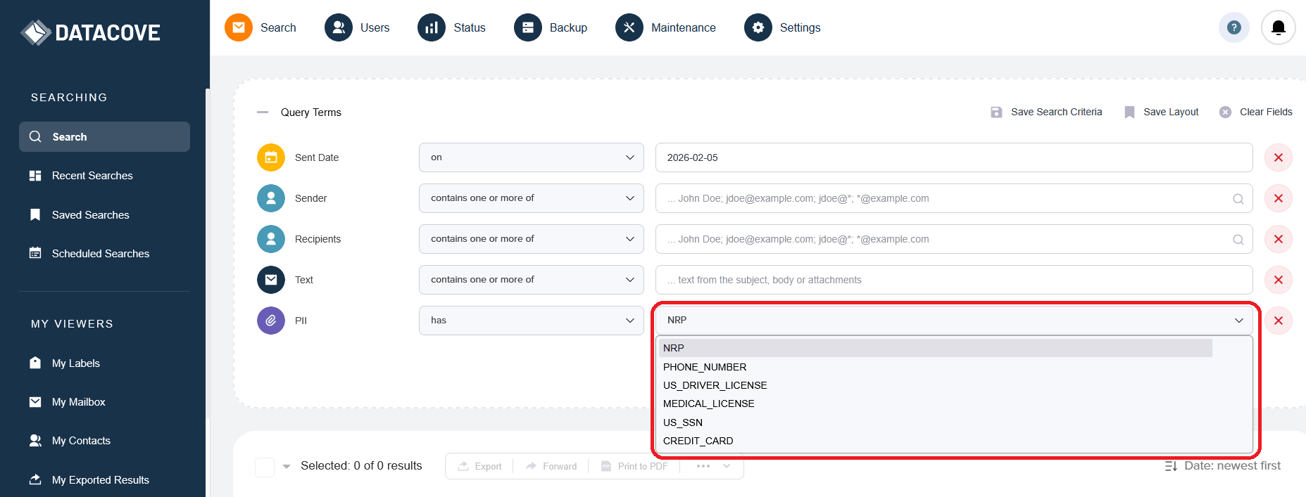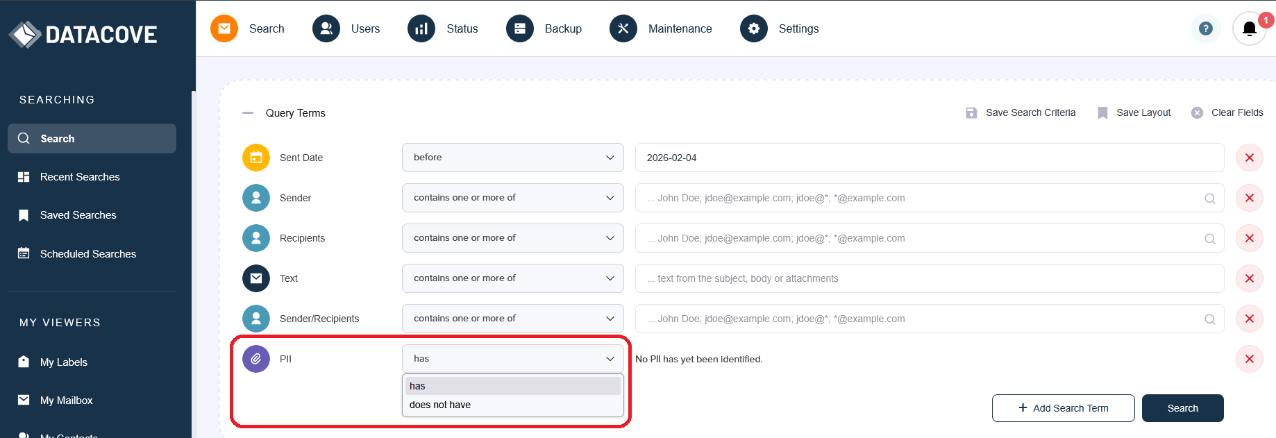 PII Detection’s search operates similarly to other searches, allowing for rendering content that exists that meets the specified criteria or to specifically hide content that holds it while conducting other searches.