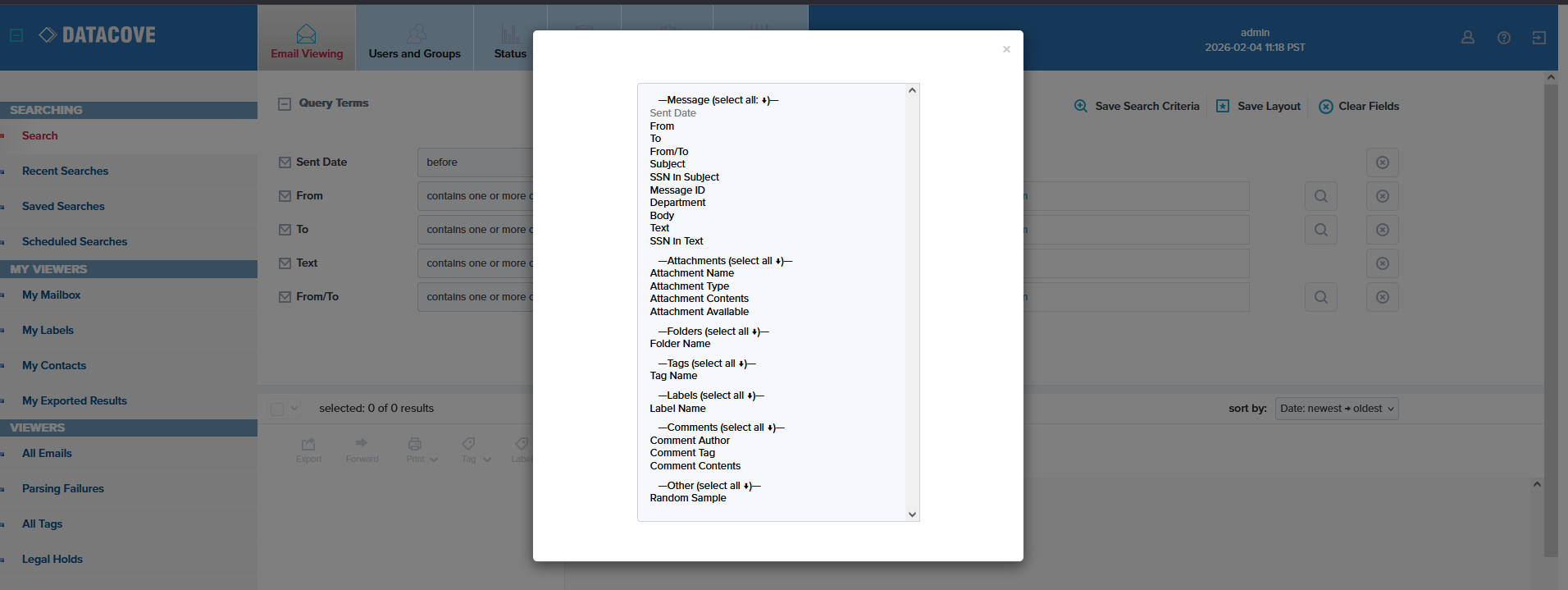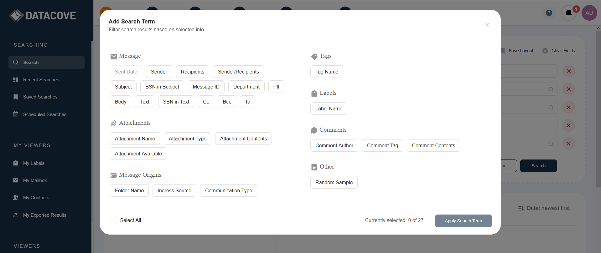 When searching emails, advanced search term additions are now a pop-up window with clearly defined buttons and borders, for an easier view and selection of search terms that can help an eDiscovery case.
